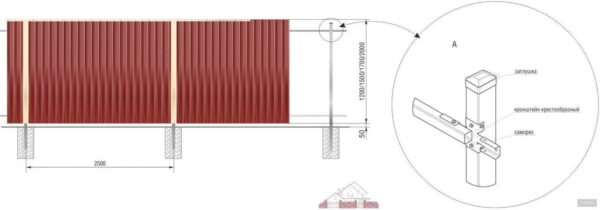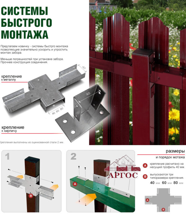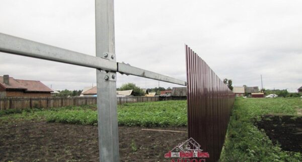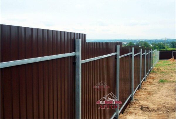 Забор из профнастила, профлиста с каркасами из сборных оцинкованных элементов (оцинкованные столбы, прожилины, кронштейны, саморезы и др.). Прочные заводские быстросборные каркасы. Пролёты до 2,5м, длина столбов до 3м.